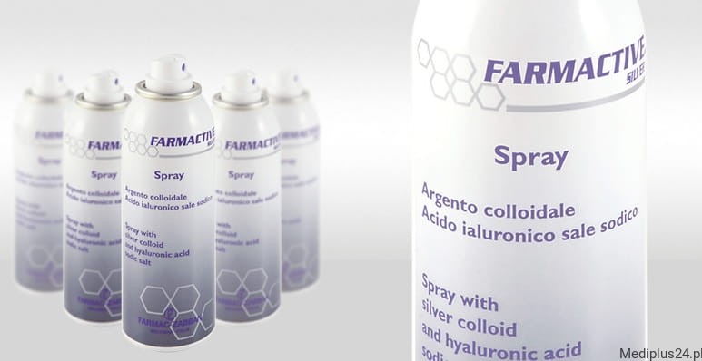 Farmactive Silver Spray jest preparatem w postaci sproszkowanej. Zawiera srebro koloidalne oraz sól sodową kwasu hialuronowego. Srebro koloidalne posiada właściwości antybakteryjne, dzięki czemu zabezpiecza ranę przed infekcją i przeciwdziała rozwojowi zakażenia nawet w przypadku stosowania tradycyjnych opatrunków z gazy. Kwas hialuronowy jest polisacharydem, który znajduje się naturalnie w tkance łącznej ludzkiego ciała.