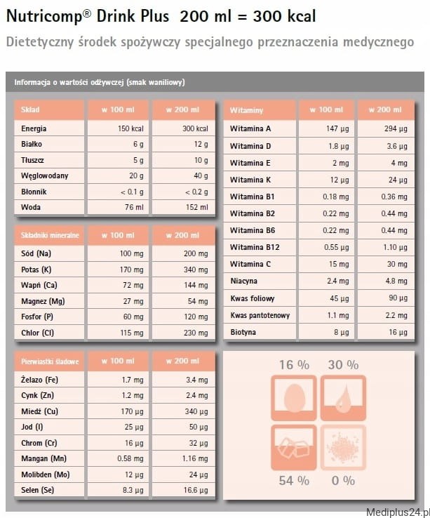 - bezglutenowy, bez cholesterolu, z niską zawartością laktozy i puryny (Nutricomp ® Drink Plus o smaku czekoladowym zawiera 58,5 mg/100 ml puryny ze względu na zawartość kakao w proszku)