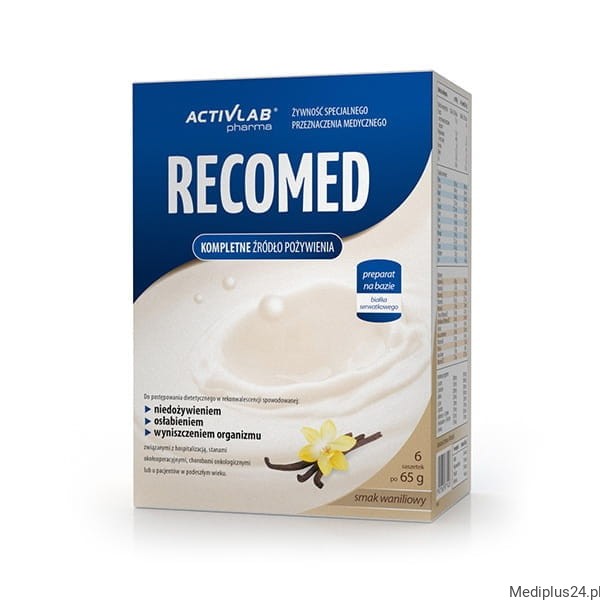 RecoMed zawiera wszystkie niezbędne składniki odżywcze: białko, węglowodany, tłuszcz, błonnik pokarmowy oraz komplet witamin i składników mineralnych. Skoncentrowana forma produktu ułatwia podawanie i nie obciąża dodatkowo organizmu chorego. Białko obecne w produkcie to najwyższej jakości koncentrat białka serwatkowego (WPC) o wartości biologicznej BV 104. Skład aminokwasowy białka został ponadto zoptymalizowany przez dodanie aminokwasów w proporcjach niezbędnych do zwiększenia wartości odżywczej białka – uzyskania optymalnych proporcji aminokwasów egzogennych (EAA) zalecanych w dziennym spożyciu przez Światową Organizacje Zdrowia (WHO).
